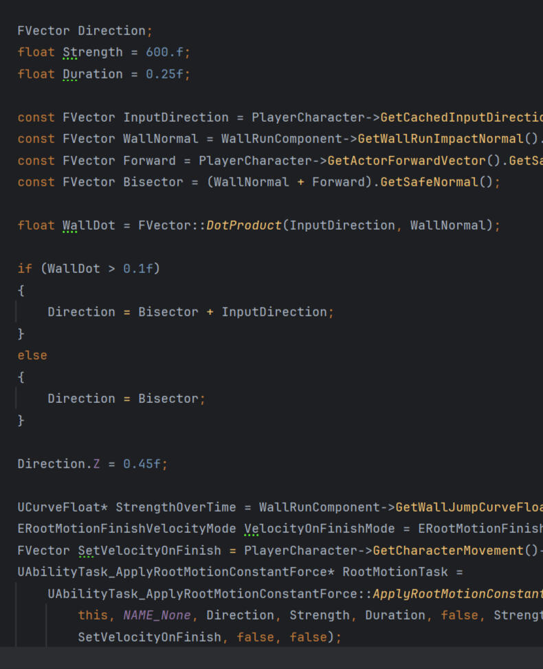 One of the primary benefits of the ability system was that abilities can naturally block other abilities. For instance, I used this to ensure that when the player is currently performing a dodge roll, they are blocked from activating an attack. However, the inverse is not true. The player can perform a dodge roll when they are attacking. This let attacks be cancelable which was one of my primary goals to ensure the player felt free. The gameplay ability system gave me the freedom to set how abilities talk to each other in a clean and organized matter. This allowed me to detail the gameplay abilities and improve the overall feeling of the game.Gameplay abilities also let me control when abilities could be activated based on the player's current stats. For instance, if the player doesn’t have enough Mana to perform a wall run, then the ability simply won’t activate. The same logic applied for stamina and dodge rolls. It also let me control how much of each stat each ability drained. This provided a flexible and organized system for me to add ability drains that could scale with the game as it grew. I wouldn’t have to worry about checking for Mana or Stamina in each and every ability since every gameplay ability automatically had a checking system in place.I used GAS to share abilities between enemies and players if the behavior was largely the same. For instance, both enemies and players can grab items found in the world, so they are competing for the same resource. Players and enemies essentially needed the exact same ability applied to them to pick up an item. Thanks to the way abilities were organized, I was easily able to grant both of them the same ability, and the functionality simply worked between both classes. If players and enemies needed fundamentally different abilities (for instance, enemies can’t wall run) then I could simply not apply the same ability or write a completely new one to match the expected behavior. Essentially, GAS allowed me to have a component like structure for any action players, enemies, or NPCs could take. This sort of flexibility allowed me to easily add abilities in my game without worries about scope-creep or organization. Since abilities could easily block each other through a tag-based system, I never had to worry about competing abilities interfering with each other.